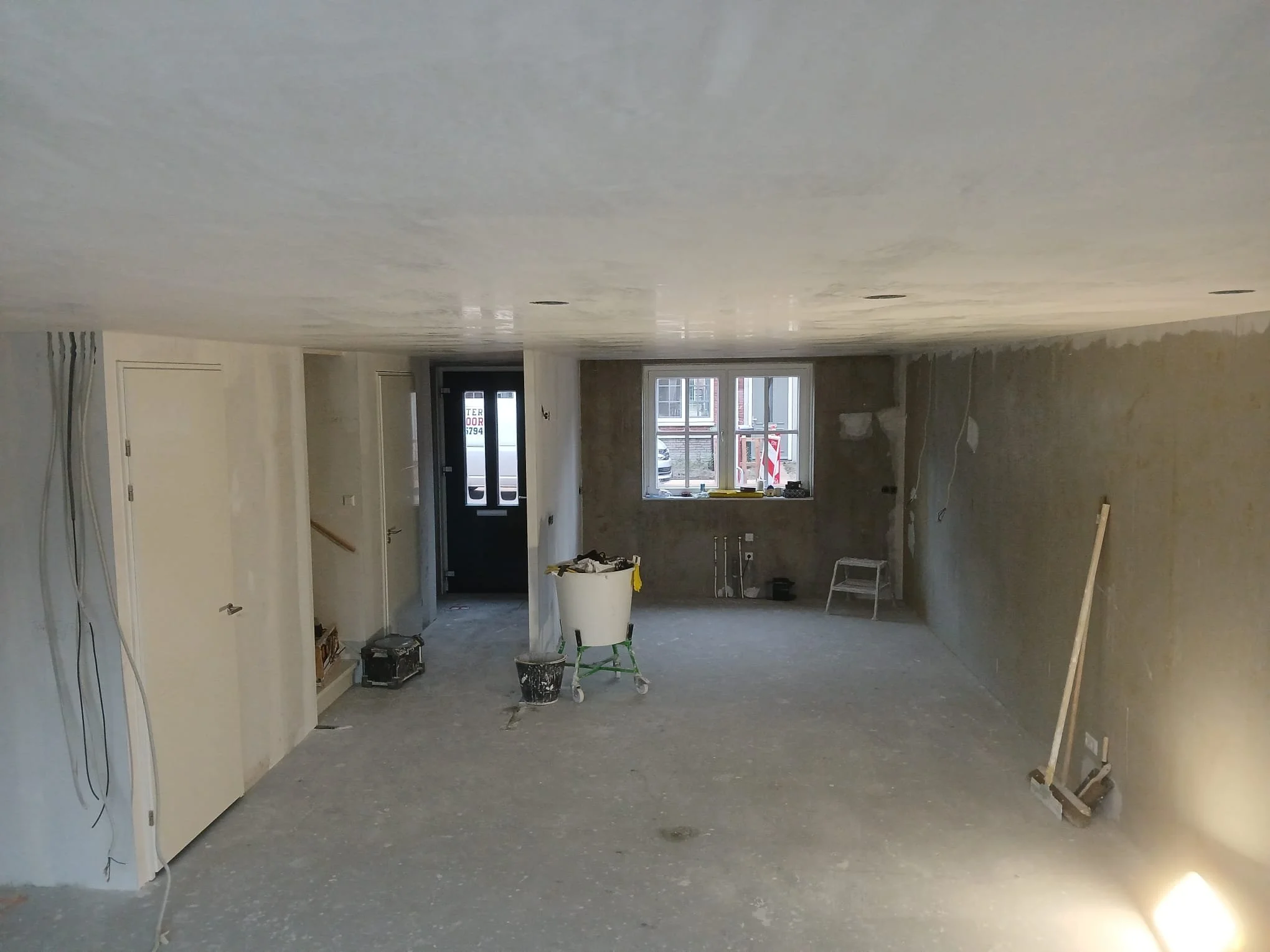 Op dit renovatie project (zie eerste 4 foto’s) hebben we de wanden voorzien van raapwerk/dik stucwerk, en alle neggekanten/dagkanten opnieuw opgedikt met gipsplaten en naderhand hoeknaalden afgesteld. Ook hebben we wapeningsgaas aangebracht op de dichtgemetselde deursparingen.